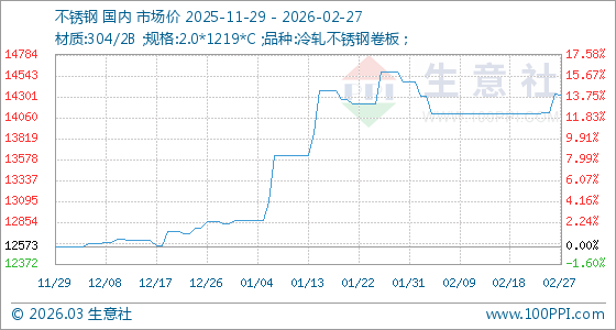 2月27日,生意社不銹鋼基準(zhǔn)價(jià)為14333.33元/噸,與本月初(14473.33元/噸)相比,下降了0.97%。