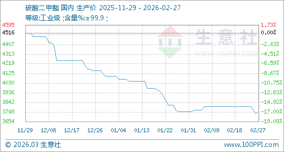 2月27日,生意社碳酸二甲酯基準價為3733.33元/噸,與本月初(3750.00元/噸)相比,下降了0.44%。