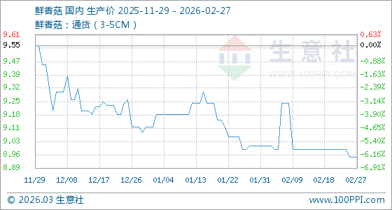 2月27日,生意社鮮香菇基準(zhǔn)價為8.95元/公斤,與本月初(9.01元/公斤)相比,下降了0.67%。