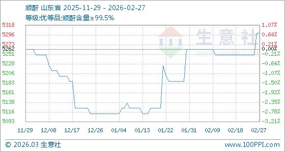 2月27日,生意社順酐基準價為5300.00元/噸,與本月初(5262.50元/噸)相比,上漲了0.71%。