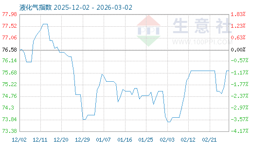 3月1日生意社液化氣指數(shù)為75.77,與昨日持平,較周期內(nèi)最高點125.66點(2012-03-25)下降了39.70%,較2020年05月31日最低點45.19點上漲了67.67%。(注:周期指2011-09-01至今)