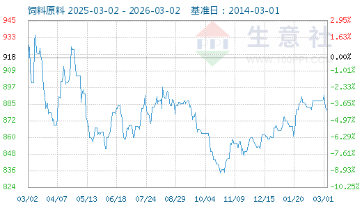 2月15日生意社飼料原料為887點,與昨日持平,較周期內(nèi)最高點1357點(2022-11-10)下降了34.64%,較2016年04月10日最低點747點上漲了18.74%。(注:周期指2014-03-01至今)
