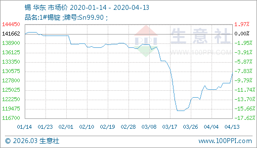 錫04月13日最新價格130225.00元/噸,最近5天上漲3.46%,20天上漲8.96%。