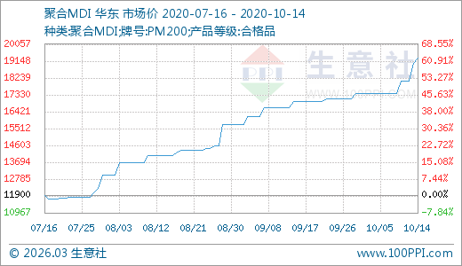 MDI 10月14日最新價(jià)格19300.00元/噸,最近5天上漲10.92%,20天上漲12.87%,30天上漲13.86%,60天上漲37.37%。