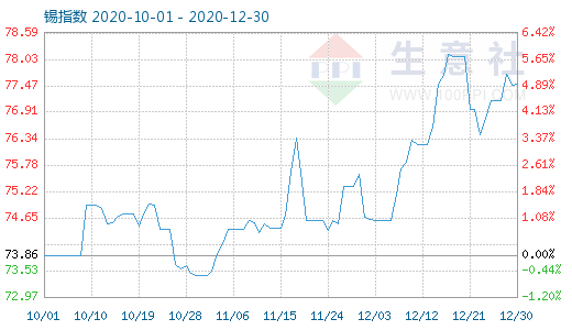 12月30日錫商品指數(shù)為77.51,較昨日上升了0.03點(diǎn),較周期內(nèi)最高點(diǎn)100.25點(diǎn)(2011-09-05)下降了22.68%,較2015年12月09日最低點(diǎn)42.86點(diǎn)上漲了80.84%。(注:周期指2011-09-01至今)