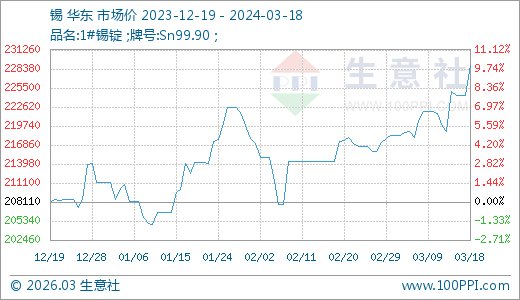 03月18日錫228860.00元/噸 5天上漲4.57%