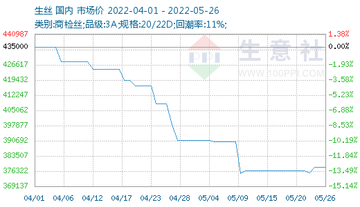 根據(jù)生意社價(jià)格監(jiān)測(cè)顯示,本周(5月23-27日)國(guó)內(nèi)繭絲市場(chǎng)價(jià)格窄幅波動(dòng),截止5月26日干繭市場(chǎng)均價(jià)130000元/噸,較周初上漲4.00%,同比下跌4.76%。生絲市場(chǎng)均價(jià)378125元/噸,較周初上漲0.67%,同比下跌8.33%。本周,國(guó)內(nèi)生絲現(xiàn)貨電子交易價(jià)格繼續(xù)小幅收紅,現(xiàn)貨面上,這幾日生絲價(jià)格較上周末比價(jià)格相差不大,部分干繭絲廠家加大點(diǎn)出貨力度。