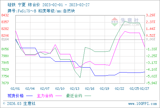 2月硅鐵行情持續(xù)的下跌,整個市場一直處于低迷態(tài)勢。前期由于期貨盤面下跌,加之原料蘭炭價格下調(diào),在眾多不利因素條件下,硅鐵現(xiàn)貨行情持續(xù)走低,但在上周,受到內(nèi)蒙古阿拉善盟一煤業(yè)公司露天煤礦發(fā)生大面積坍塌事件的影響,原料蘭炭止跌回漲,硅鐵現(xiàn)貨價格小幅回調(diào)。根據(jù)生意社價格監(jiān)測,硅鐵(牌號:FeSi75~B;粒度等級/mm:自然塊)02月27日寧夏地區(qū)報價在7800-7900元/噸,均價7804元/噸,較月初跌4.41%。