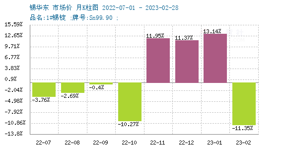 商品價(jià)格K柱圖,運(yùn)用價(jià)格走勢(shì)K線的理念,以柱狀圖形式,反映每周或者每月的價(jià)格漲跌變化,投資者可以根據(jù)K柱圖的變化,來進(jìn)行買賣投資。紅色表示:上漲;綠色表示:下跌;K柱高度表示:漲跌幅度。從上圖可以看出2022年11月后受宏觀因素影響,錫價(jià)整體上行為主,自2月始,價(jià)格回落。