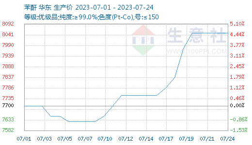 從生意社苯酐商品行情分析系統(tǒng),截止7月24日,鄰法苯酐報價為8050元/噸,較上周末7月16日苯酐價格7750元/噸上漲,漲幅3.87%;較月初7月1日苯酐價格7700元/噸上漲,漲幅4.55%。苯酐裝置短停,苯酐行情堅挺,本周苯酐價格震蕩上漲,鄰苯下游需求弱勢暫穩(wěn),鄰二甲苯行情上漲動力仍存。