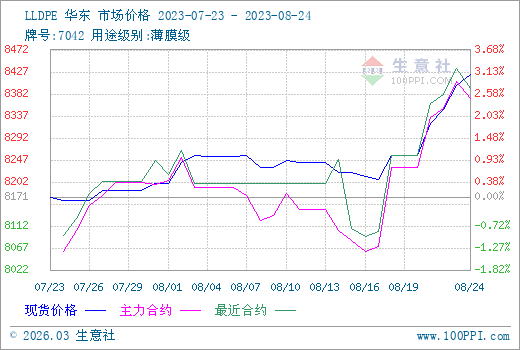 據(jù)生意社商品行情分析系統(tǒng)監(jiān)測(cè),LLDPE(7042)8月17日國(guó)內(nèi)價(jià)格在8207元/噸,8月24日均價(jià)在8421元/噸,期間報(bào)價(jià)上漲2.61%。
