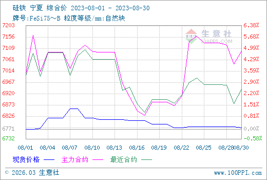 8月份硅鐵現(xiàn)貨市場弱強(qiáng)運(yùn)行,漲幅在20-100元/噸。市場供應(yīng)相對充足,但需求增長相對緩慢,導(dǎo)致硅鐵價(jià)格整體上保持平穩(wěn)。據(jù)生意社商品行情分析系統(tǒng),8月30日硅鐵(牌號(hào):FeSi75~B;粒度等級(jí)/mm:自然塊)寧夏地區(qū)市場報(bào)價(jià)在6750-6800元/噸附近,市場均價(jià)6778元/噸,月漲0.11%。