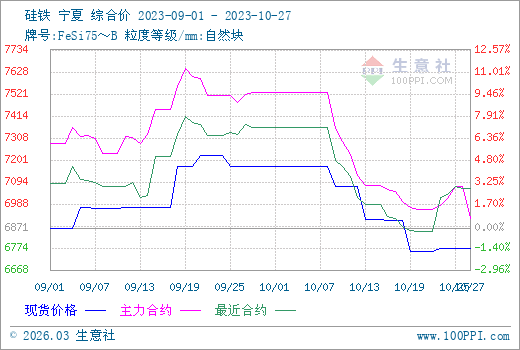 本周硅鐵市場偏弱穩(wěn)運行,行情支撐力度相較偏弱,一方面上游蘭炭價格走跌;一方面部分主產(chǎn)地區(qū)硅鐵開工繼續(xù)增加;再者,鋼廠對硅鐵等合金采購壓價情緒較濃,貿(mào)易商多謹(jǐn)慎觀望市場,總體市場情緒維持承壓。據(jù)生意社商品行情分析系統(tǒng),10月27日硅鐵(牌號:FeSi75~B;粒度等級/mm:自然塊)寧夏地區(qū)市場報價在6700-6800元/噸附近,市場均價6771元/噸。