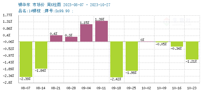 商品價(jià)格K柱圖,運(yùn)用價(jià)格走勢(shì)K線的理念,以柱狀圖形式,反映每周或者每月的價(jià)格漲跌變化,投資者可以根據(jù)K柱圖的變化,來進(jìn)行買賣投資。紅色表示:上漲;綠色表示:下跌;K柱高度表示:漲跌幅度。從月度K柱圖可以看出2022年11月后受宏觀因素影響,錫價(jià)連續(xù)上漲3個(gè)月,自2023年2月價(jià)格單月下跌11.35%,近三個(gè)月錫價(jià)走勢(shì)窄幅波動(dòng)。從周度度K柱圖可以看出錫錠市場(chǎng)近期走勢(shì)整體偏弱。