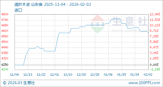 2月2日,生意社闊葉木漿基準(zhǔn)價(jià)為4616.67元/噸,與本月初持平。