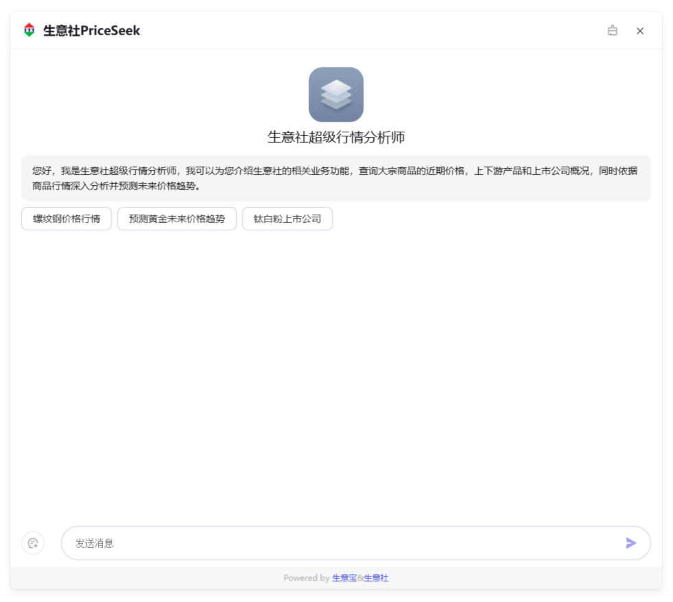 PriceSeek是基于Deepseek大模型與生意社價(jià)格大數(shù)據(jù)開發(fā)的大宗原材料領(lǐng)域的AI智能體,俗稱“生意社超級分析師”,可以為你專業(yè)分析500多種原材料的價(jià)格行情及解答相關(guān)問題!